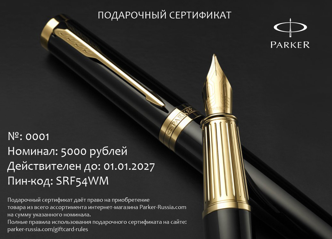 Подарочный сертификат Parker 5000 от официального дилера Parker в Севастополе. Вы можете дополнительно заказать гравировку, которая подчеркнет Вашу оригинальность и придаст памятность статусному подарку. Все ручки Паркер поставляются в фирменном футляре.
